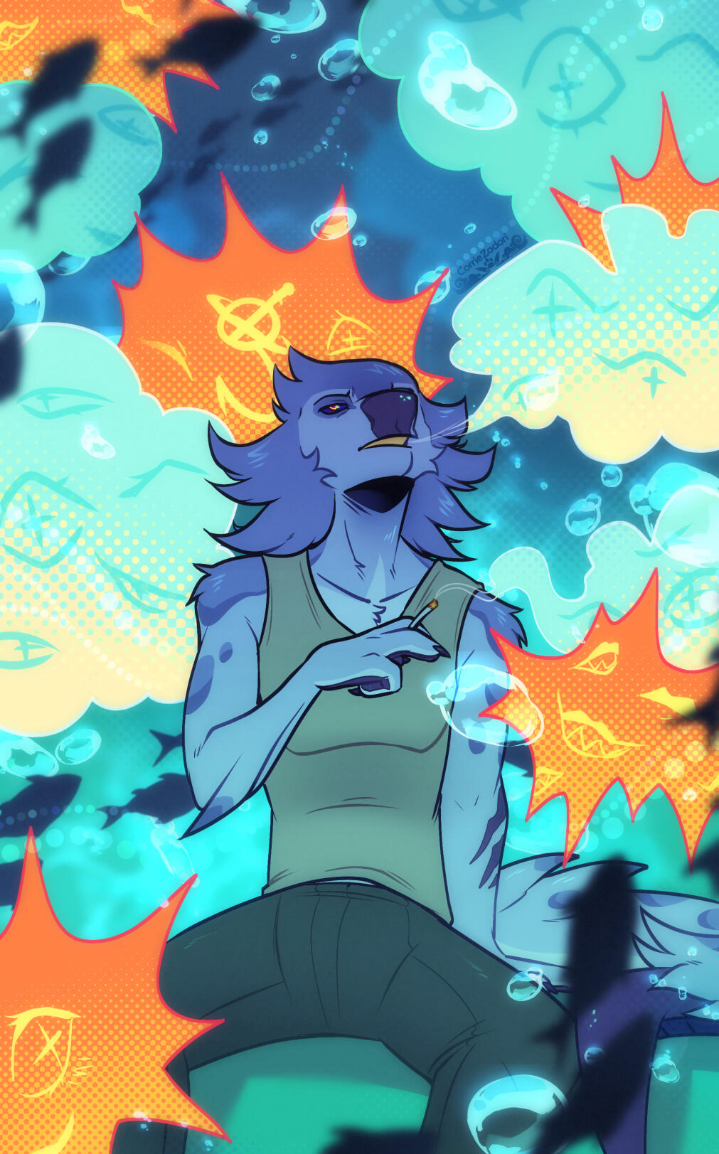 Fully flat colored with colored lineart and a simple, abstract background
